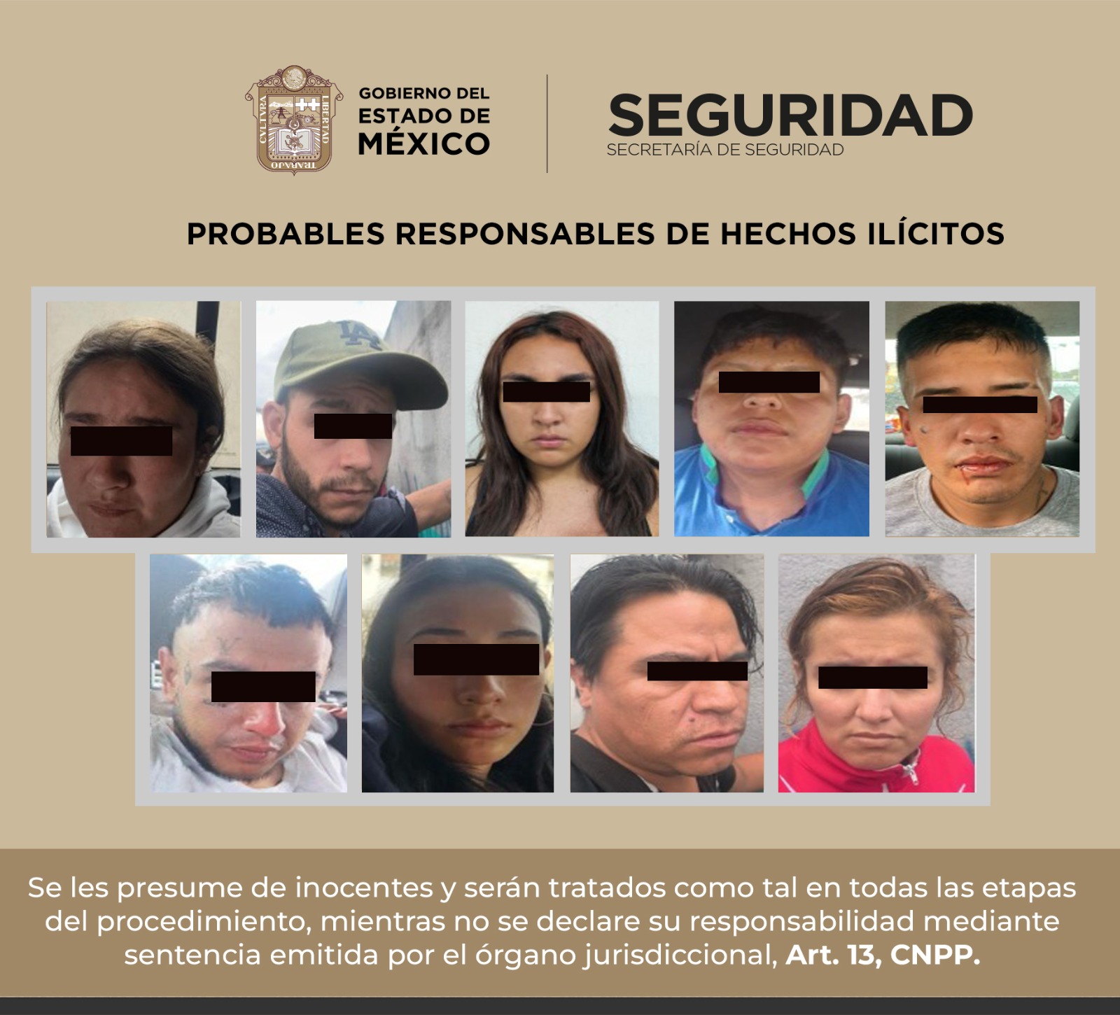 *Otzolotepec, Estado de México, 13 de octubre de 2025.-* En acciones distintas y derivado de trabajos de investigación en gabinete y en campo, elementos de la Unidad de Inteligencia e Investigación para la Prevención (UIIP) de la Secretaría de Seguridad del Estado de México (SSEM), la Marina (SEMAR), Defensa, Guardia Nacional (GN),Fiscalía General de Justicia del Estado de México (FGJEM) y de las Policías Municipales de Temoaya, Toluca y Otzolotepec detuvieron a nueve personas probables implicadas en los delitos de homicidio, secuestro, portación de arma de fuego y contra la salud, quienes además podrían ser integrantes de una organización delictiva.