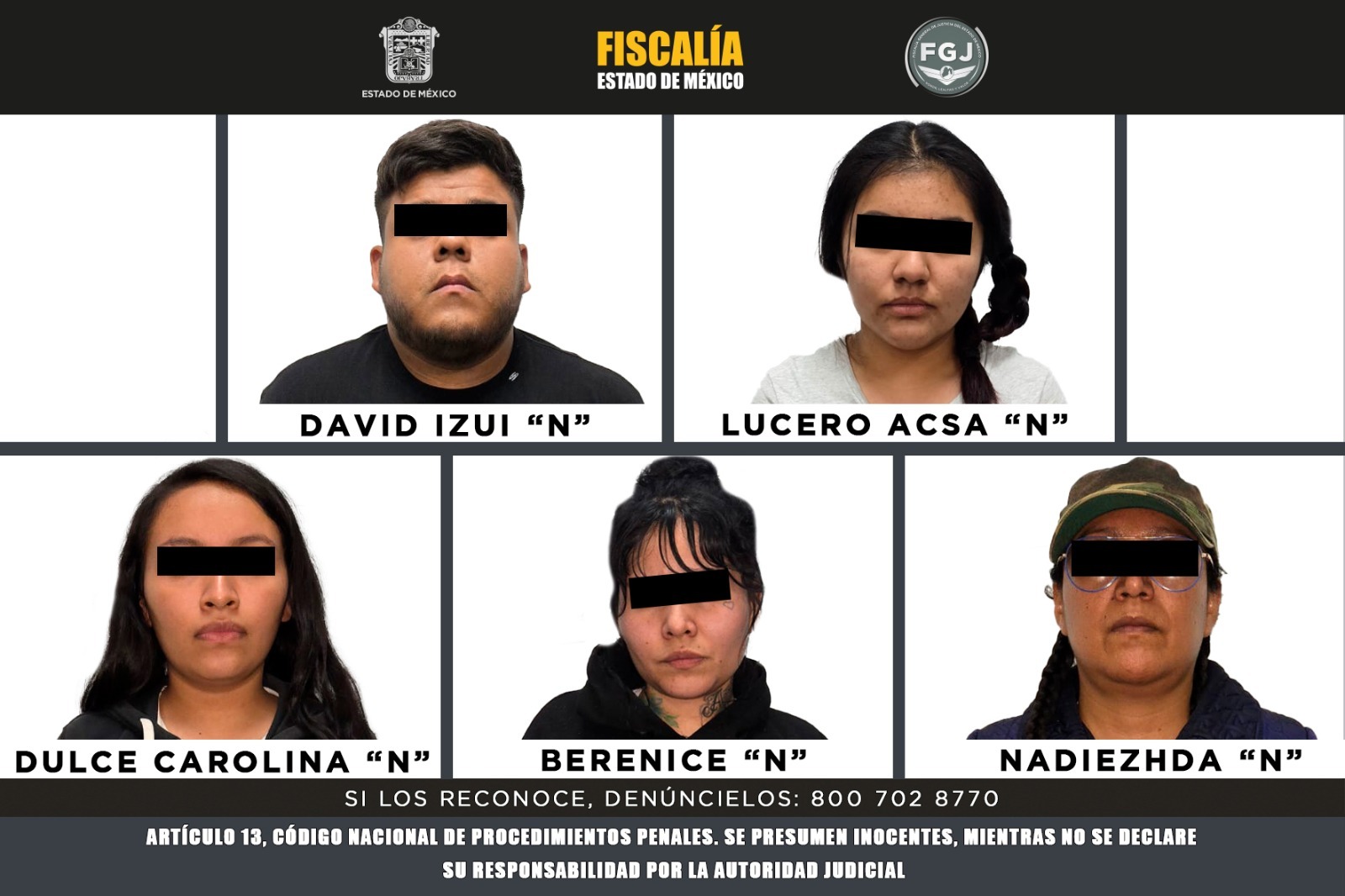 Nezahualcóyotl, Estado de México, 18 de septiembre de 2025.- Elementos de la Fiscalía General de Justicia del Estado de México detuvieron por cumplimiento de orden de aprehensión a cuatro mujeres identificadas como Lucero Acsa “N” de 23 años de edad, Dulce Carolina “N” de 26 años, Berenice “N” de 21 años y Nadiezhda “N” de 42 años, así como a David Izui “N”, quienes son investigados por su posible participación en el delito de homicidio calificado en agravio de una mujer que se encontraba al interior de un anexo ubicado en este municipio.