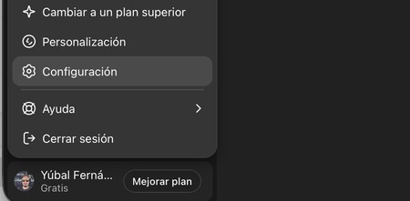 Para configurar el control parental, primero tienes que abrir ChatGPT usando la cuenta de quien vaya a administrar la familia. Una vez dentro, entra en la configuración de ChatGPT pulsando en tu imagen de perfil y eligiendo esta opción.