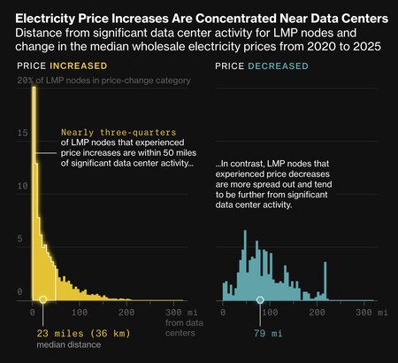 La condena de los centros de datos. El 70% de los puntos en los que se registraron aumentos de precios se encuentran a menos de 80 kilómetros de centros de datos con actividad significativa. Es un dato que deja claro que el impacto de esos centros de datos sobre la factura de la luz de los residentes es claro.