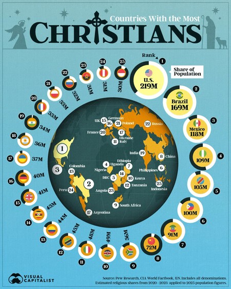 ¿De cuántos creyentes hablamos? La respuesta vuelve a ser la misma: depende de la fuente. Aunque dado el gran tamaño de China (1.400 millones de habitantes) incluso los cálculos más conservadoras dejarían un censo de decenas de millones. ¿Cuántos? Hace años un estudio de la Universidad de Pekín hablaba de 40 millones, World Population Review eleva el cálculo a 49,2 millones y Visual Capitalist incluso ha ido más allá situando la cifra cerca de los 72 millones.