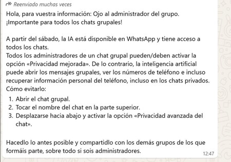 Son muchos los usuarios de WhatsApp que están recibiendo un mensaje inquietante. En él se indica que «si no activamos una opción de privacidad avanzada, las IAs pueden aceder a los mensajes de grupo, ver los números de teléfono e incluso pillar info personal del móvil… incluso en chats privados». El mensaje no es más que un bulo que ya se difundió en verano y que vuelve a usar WhatsApp como vía de difusión. Te explicamos por qué.