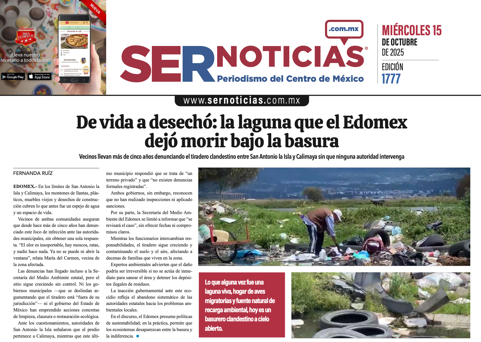 Inicio/Portada Periódico/🚨⚡️ #Portada_EDOMEX De vida a desechó: la laguna que el Edomex dejó morir bajo la basura #Toluca 🚨⚡️ Portada Periódico 🚨⚡️ #Portada_EDOMEX De vida a desechó: la laguna que el Edomex dejó morir bajo la basura #Toluca 🚨⚡️ SerNoticas Send an email 14 octubre 2025 Facebook X WhatsApp Telegram Compartir por correo electrónico Ser Noticias Octubre 15Descarga Me gusta esto:Me gusta Cargando... Relacionado SerNoticas Send an email 14 octubre 2025 Facebook X WhatsApp Telegram Compartir por correo electrónico Mostrar más Compartir Facebook X WhatsApp Telegram