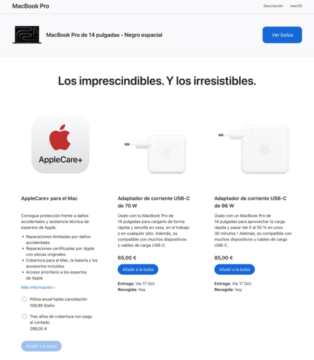 Sin embargo, Apple ofrece otra alternativa. En la siguiente pantalla, una vez configurado el ordenador y antes de completar la compra, la tienda sugiere una lista de accesorios adicionales, entre los que aparecen AppleCare+, cables o fundas. Entre esas recomendaciones figura también un adaptador de corriente USB-C de 70 W, el mismo que Apple incluye en algunos países, por 65 euros, además de una versión de 96 W por 85 euros.