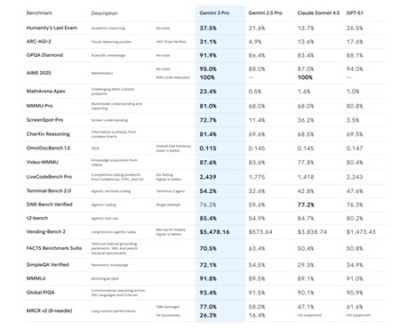 Según Google, los resultados de las pruebas de Gemini 3 lo sitúan por encima de todos sus competidores en prácticamente todos los escenarios.