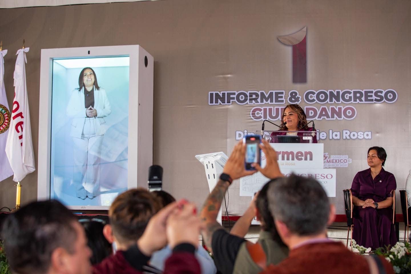 La Diputada, Maestra Carmen de la Rosa, ha utilizado las tecnologías del presente y del futuro, en su informe al integrar desde pantallas interactivas hasta un avatar de su persona, (es la primera mujer política en hacerlo en el Estado de México) pasando por códigos QR, contenidos de valor y escucha activa, para transformar el tradicional acto protocolario cuadrado, aburrido y acartonado a uno innovador, humanista, inclusivo, cercano y con propósito de no solo informar, sino de transmitir y mostrar adelantos tecnológicos de una manera lúdica y orgánica.