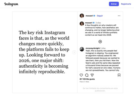 En busca de algo real. Explica Mosseri que ahora sus usuarios y usuarias mantienen al día a sus contactos sobre su vida personal con «fotos improvisadas de zapatos y posados poco favorecedores» compartidos a través de DM. Y esto también afecta a creadores de contenido: la omnipresencia de imágenes hechas por IA va a traer un cambio: el adiós de esas fotografías de aspecto pro en favor de una estética más real e improvisada: «Las imágenes favorecedoras son baratas de producir y aburridas de consumir. La gente quiere contenido que se sienta real».