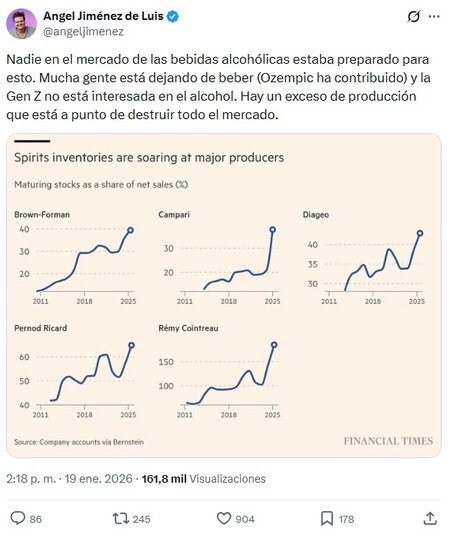 Otro factor clave es que el consumo de alcohol (al menos de cierto tipo de alcohol) parece estar moderándose a medida que más gente se centra en su salud física y consume medicamentos para perder peso, como Wegovy u Ozempic. No es nada excepcional si se tiene en cuenta que en 2023 un estudio de Walmart ya advirtió que el consumo de Ozempic estaba reduciendo las ventas de alimentos.