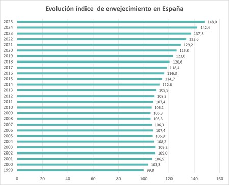 ¿Qué significa eso? Que en España viven ya 148 personas mayores de 64 años por cada 100 menores de 16. Hace solo un año ese mismo índice marcaba 142,4% y si nos vamos a finales de los 90 estaba en 99,8%, lo que significa que en nuestro país residía casi la misma proporción de ancianos que menores de 16 años.