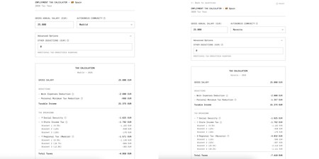Lo vemos mejor con un ejemplo: 25.000 euros anuales en Madrid y en Navarra, dos comunidades autónomas de lo más particulares: la capital del estado ha deflactado los tramos y tiene uno de los mínimos más bajos de España. Navarra por su parte tiene su propia Hacienda, régimen foral y ley de IRPF. Así, los tramos están modificados y hay diferencias en deducciones y cálculos como la estructura de la base del ahorro. Para la simulación supondremos que somos personas solteras y sin descendencia.