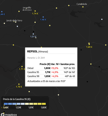 Pero el sentir de los conductores es otro muy distinto. Basta un rápido repaso por este mapa de eldiario.es en el que se registra la subida en el precio de cada estación de servicio. En él se refleja claramente que los precios han subido allí donde hay más población o en los grandes corredores de movilidad, como las autopistas más frecuentadas.