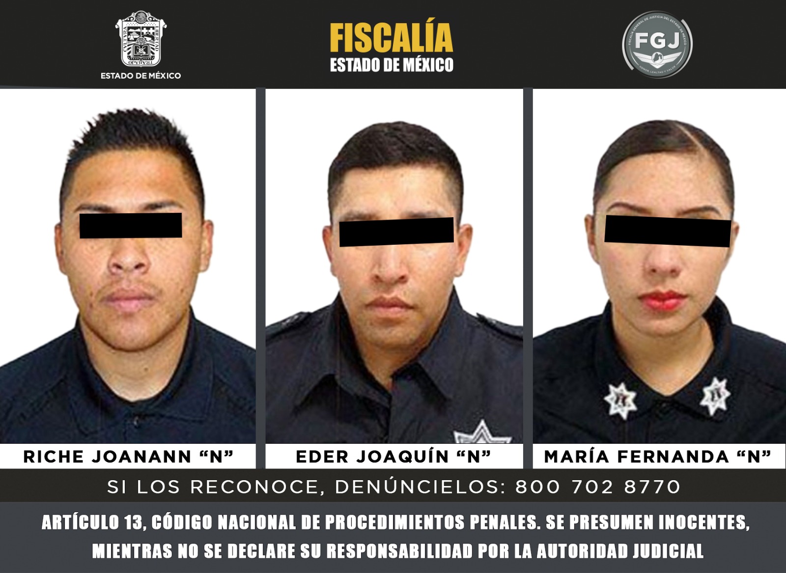 Naucalpan, Estado de México, 22 de marzo de 2026.— La Fiscalía General de Justicia del Estado de México informó la vinculación a proceso de tres elementos de la policía municipal de Naucalpan, por su probable responsabilidad en los delitos de abuso de autoridad y tortura en agravio de una mujer trans.