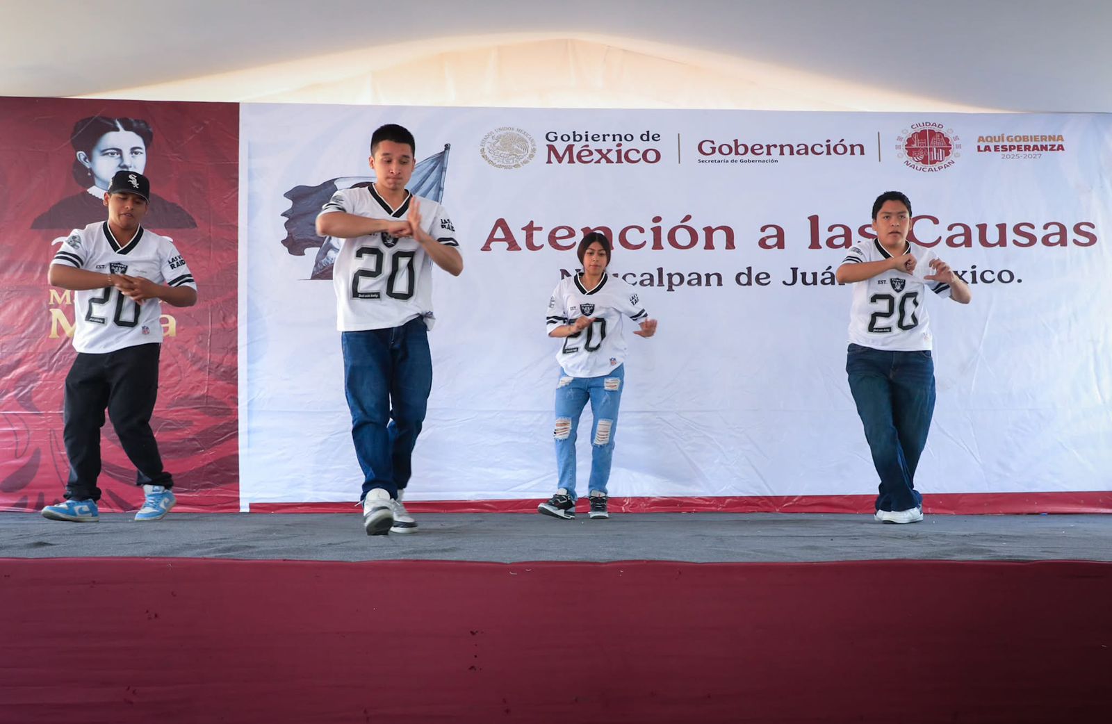 Naucalpan de Juárez, Méx., 28 de marzo de 2026.- El presidente municipal, Isaac Montoya Márquez, encabezó la Mesa de Paz y la estrategia de Atención a las Causas “Bailemos Juntos por la Paz” en la Glorieta Morelos, donde niñas, niños y jóvenes de academias locales ofrecieron una muestra de baile como parte de las acciones para recuperar espacios públicos.