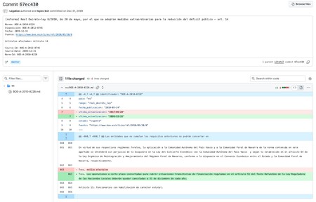 Qué ha cambiado de esta ley. Pero las leyes tienen sus borradores, textos consolidados y posteriores reformas, así que a veces tener claro qué está vigente y qué no es una odisea. Así que ha añadido cada reforma como commit, con la fecha real de publicación. De esta forma, aunque no tengas ni idea de leyes, puedes ver qué ha cambiado exactamente en la normativa: en rojo está lo que se borra y en verde lo que se añade. Lo vemos mejor con un ejemplo, el del Real Decreto-ley 8/2010: