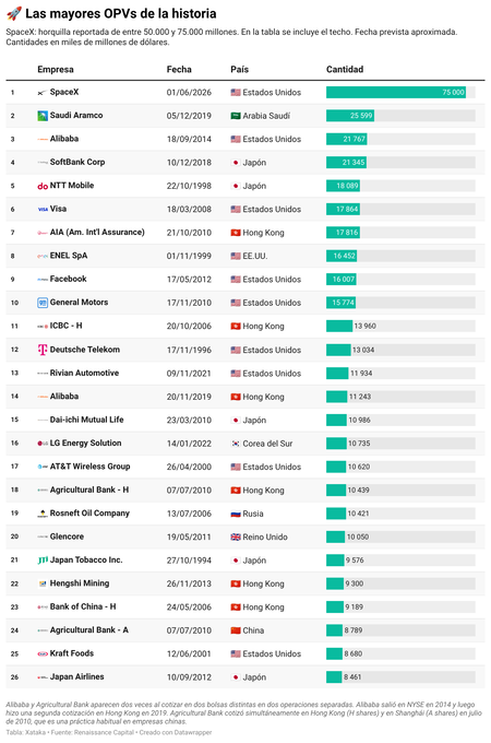 Por qué es importante. La valoración que maneja la empresa de Musk supera el billón y medio de dólares, y el objetivo es captar entre 50.000 y 75.000 millones de euros antes de que acabe junio. Para ponerlo en perspectiva: la OPV de la petrolera árabe Saudi Aramco en 2019, hasta ahora la más grande de la historia, recaudó algo más de 25.000 millones.