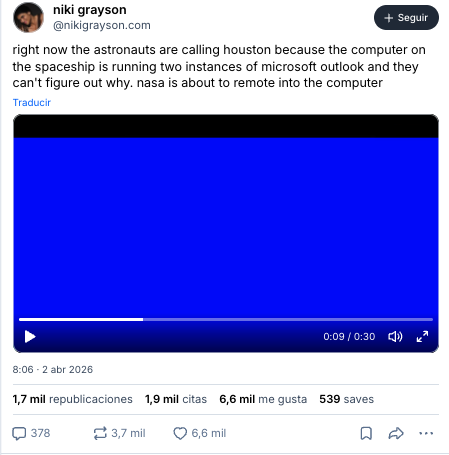 Por qué es importante. La misión Artemis II es histórica y el stream ha dejado para la posteridad sus primeras horas de vuelo y esta anécdota que constituye el que probablemente sea el primer ticket de soporte técnico de Microsoft generado desde el espacio. Más allá del chascarrillo, el episodio pone de manifiesto que la exploración espacial de la actualidad y su tecnología de vanguardia convive con el software de productividad comercial y sus fallos habituales. Cuando una agencia estandariza toda su infraestructura sobre un único ecosistema tecnológico, los problemas de ese ecosistema se convierten también en problemas de la misión.