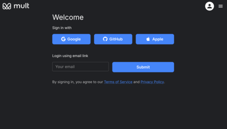 Lo primero que tienes que hacer es entrar en la web de mult.dev. En ella, tienes que crear una cuenta o iniciar sesión en una de ella, algo que es totalmente imprescindible para poder usar el servicio. Puedes usar tus cuentas de Google, GitHub o Apple, o crear cuenta con un correo electrónico.